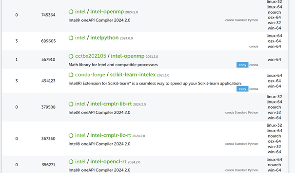 Thankfully for Anaconda Inc, by 2020, the world saw the rise of GPGPU computing driven by NVIDIA (CUDA). Software could run maths and simulations on NVIDIA graphic cards (GPU) rather than Intel/AMD processors (CPU). Once again, the libraries and tools to use GPU came in variable forms and it required quite the effort to get anything usable out of them. Once again, Anaconda could step in to build and package and distribute GPU libraries in usable form. This is mostly a story around NVIDIA/CUDA that I should cover in separate blog post. Intel happens to sell both CPU and GPU. (While I mostly focused on the MKL that is the very first building block of the Anaconda ecosystem, there are certainly a few more Intel software that the Anaconda ecosystem very much uses or needs).